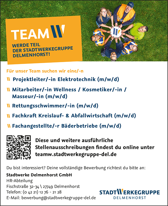 Als fest in Delmenhorst und der Region verankerte Unternehmensgruppe trägt die StadtWerkegruppe erheblich zur Wirtschaftskraft bei, sichert Arbeitsplätze und erzielt eine hohe Wertschöpfung. Die StadtWerkegruppe ist mit ihren Unternehmen nicht nur einer der größten Arbeitgeber in Delmenhorst, sondern auch ein sehr attraktiver, der sich unter anderem durch krisensichere Arbeitsplätze, tarifliche Bezahlung und regionale Stabilität auszeichnet. Sie bietet moderne Arbeitsplätze und eine gute Work-Life-Balance wie flexible Arbeitszeiten und Homeoffice-Möglichkeiten. So können sich die Mitarbeiterinnen und Mitarbeiter der StadtWerkegruppe die Arbeitszeiten flexibel einteilen – soweit es im Rahmen der Tätigkeit möglich ist. Selbstverständlich werden Arbeitskleidung und Ausstattung kostenlos zur Verfügung gestellt.